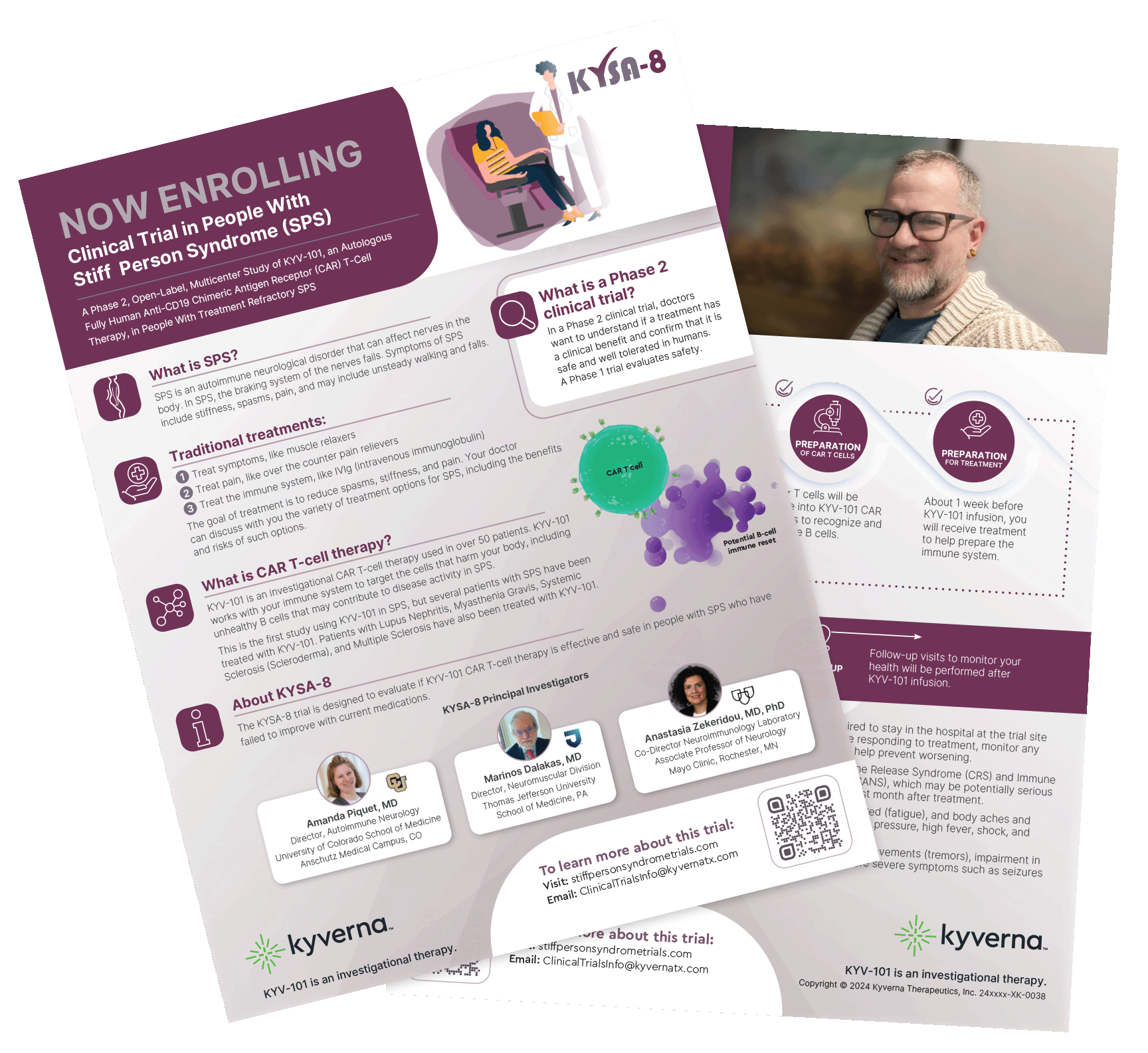 Contact UsKYV-101 is an investigational CAR T-cell therapy used in over 50 patients. KYV-101 works with your immune system to target the cells that harm your body, including unhealthy B cells that may contribute to disease activity in SPS.